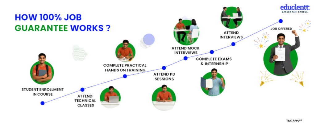 100% Job Guarantee* is a program offered by Educlentt. in which enrolled student will get Guaranteed Placement from us in IT Sector. This program is applicable on certain courses only. *T&C Apply